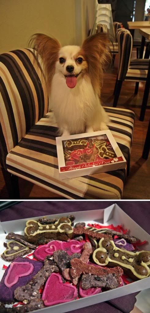 I bought her a box of valentine cookies from Pawlicious last week. The happy girl with her present. The cookies are supposedly made with purpleberry, blueberry and cranberry. I tried it myself (Popo can't finish all herself) and they were not bad. Though I don't really like having flour in her diet, so I guess first and last time.
