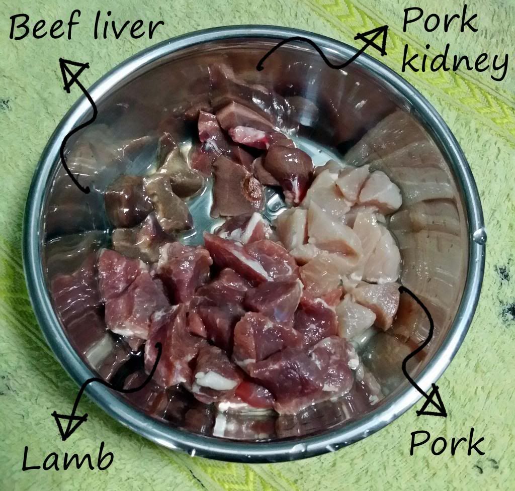 If you don't know, the standard ratio is 80-10-5-5. 80% of meat, 10% of bone, 5% of liver, and 5% of some other organ. Again, that's just a guide. Popo takes about 75% of meat, 15% of bone, 4% of liver, and 5% of kidney. The remaining 1% goes to the freeze-dried deer liver treats she gets. It's not difficult to monitor; I've done up an excel sheet and I just have to input her daily meal. Sounds tedious? Sorry I think it's fun. ^^